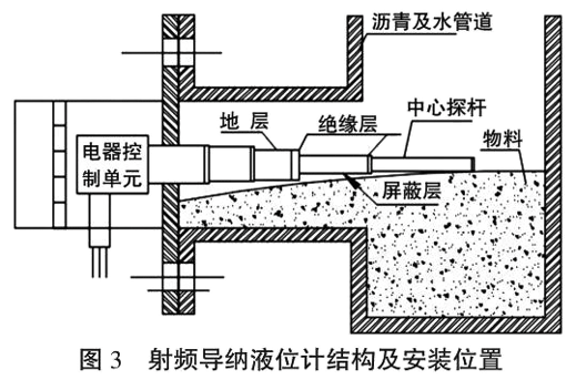 為了解決生產中因為液位計故障影響正常生產的問題,通過查閱相關資料、尋找同類型測量物位的裝置,結合公司設備工作環境、設備工藝要求和使用需求,經過前期反復論證,zui終選用射頻導納液位計進行安裝、試用。在訂購設備時,要求廠家制作與現場同型號大小的連接法蘭,保證探測桿的有效長度,以及需要傳輸信號的要求電壓,以減少對現有管道、線路的改動。射頻導納液位計結構及安裝位置如圖3所示。