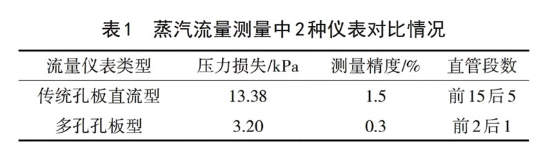 例如,在某聚丙烯生產(chǎn)項(xiàng)目中,需要對(duì)丙烯脫氣塔再沸器中的蒸汽進(jìn)行流量測(cè)量。具體測(cè)量中,該企業(yè)ZUI初選擇的是傳統(tǒng)孔板節(jié)流形式的流量儀表,但是因?yàn)楸敬雾?xiàng)目中對(duì)于工藝精度有著非常高的控制要求,需將精度控制在1%以內(nèi),同時(shí)應(yīng)盡可能將測(cè)量過程中的壓力損失降低,且對(duì)于空間布局也具有一定的限制,在這樣的情況下,傳統(tǒng)孔板節(jié)流形式的流量儀表并不能滿足該項(xiàng)目的實(shí)際測(cè)量需求。基于此,企業(yè)便對(duì)原來的方案進(jìn)行了優(yōu)化改進(jìn),選擇用多孔孔板形式的流量儀表來替代傳統(tǒng)孔板節(jié)流形式的流量儀表。借助于相應(yīng)的軟件來進(jìn)行了流量儀表的設(shè)計(jì)計(jì)算,對(duì)傳統(tǒng)孔板節(jié)流形式的流量儀表和更換之后的多孔孔板形式流量儀表進(jìn)行了對(duì)比,蒸汽流量測(cè)量中2種儀表對(duì)比情況見表1。