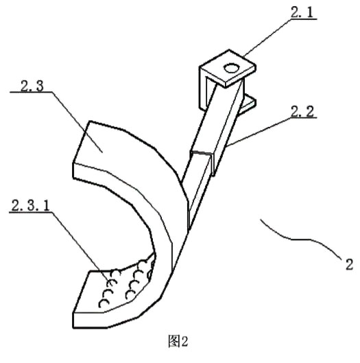 如圖2所示,所述定位裝置2包括U型連接組件2.1、可轉動伸縮桿2.2、夾持弧形件2.3,所述U型連接組件2.1固定在所述測量導管1.2上,所述可轉動伸縮桿2.2為長方形伸縮桿,所述可轉動伸縮桿2.2的右端部位通過銷軸與所述U型連接組件2.1鉸接,所述夾持弧形件2.3固定在所述可轉動伸縮桿2.2的左端面,所述夾持弧形件2.3上設有滾珠2.3.1,若干個所述滾珠2.3.1位于所述夾持弧形件2.3的內側表面上,所述滾珠2.3.1可相對所述夾持弧形件2.3滾動。
