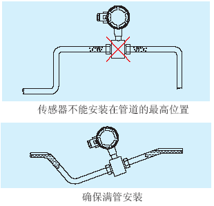 傳感器不能安裝在管道的*高位置,這個位置容易積聚氣泡。