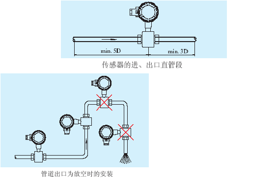 比較理想的安裝地點應選擇測量點前后有足夠的直管段。**直管段應 ≥5D , 出口直管段 ≥3D(D為傳感器公稱口徑)。