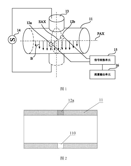 圖1顯示了現有技術中的一種電磁流量計的結構。如圖1所示,所述電磁流量計包括:流動有被測流體的測量管11,和與被測流體相接觸且對向配置在測量管11上的電極12a、12b,向被測流體施加磁場的勵磁線圈13,向勵磁線圈13供給勵磁電流、使其產生磁場的電源單元14。另外,所述電磁流量計還包括:與電極12a、12b連接用于檢測電極12a、l2b之間的感應電動勢的信號轉換單元15,從由信號轉換單元15檢測出的電極間電動勢計算出被測流體的流量的流量輸出單元16應用所述電磁流量計,當流體在測量管11中穿過由勵磁線圈13產生的磁場流動時,根據法拉第定律,就會在電極12a、12b上產生感應電動勢,流體的平均流速與電極處感應出的電壓之間具有線性關系,這一關系可以用下述公式表示:E=K*B*舉V,其中E為所產生的感應電壓,K為比例常數,B為磁場強度,D為導管直徑,而V為傳導型流體的平均流速這樣,利用信號轉換單元15和流量輸出單元16,即可測得與所述感應電動勢對應的流體的流速,進而獲得流體的流量陶瓷管電磁流量計傳感器有很多優點,但電極密封是一個很大難題。圖2為圖1中沿著與勵磁線圈13產生的磁場相垂直的平面用以顯示電極布置的剖示圖。如圖2,測量管11設有電極插孔110,所述電極插孔110為圓柱形或圓錐形,其厚度大致與測量管11的壁厚相當,電極(在這里僅標示出電極12a)內嵌于測量管11的電極插孔110中。然而,圖2所示中的電極,只有少數廠家具備特殊的燒結技術,在高溫高壓環境下制作出電極以確保電極不滲漏,實現難度極大。而采用0型圈等機械裝配密封,由于陶瓷材料表面一定厚度會變湖,使用時間一長,絕緣性就會下降,影響測量精度