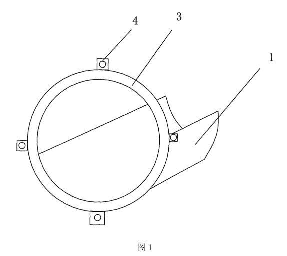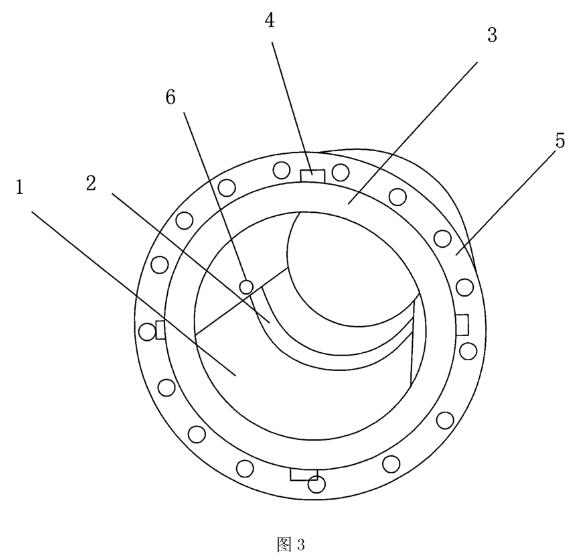 下面結(jié)合附圖和實施例對本實用新型做進一步描述。雖然本實用新型將結(jié)合較佳實施例進行描述,但應(yīng)知道,并不表示本實用新型限制在所述實施例中。相反,本實用新型將涵蓋可包含在有附后權(quán)利要求書限定的本實用新型的范圍內(nèi)的替換物、改進型和等同物參見圖1至圖4所示,本電磁流量計耐磨裝置由相向的兩塊彎曲帶法蘭3的耐磨板1組成,耐磨板1為不銹鋼板,厚3mm,其外徑彎曲度和需配套的流量計管體5內(nèi)徑相符,和襯膠緊貼,耐磨板1彎曲后的弧度高須低于感應(yīng)電極6有5mm-10mm。,相連的法蘭3材質(zhì)也為不銹鋼,厚度無要求,直徑和需配套的流量計管體5一致,法蘭3用螺釘孔4固定在電磁流量計管體5的法蘭上。彎曲的耐磨板1和法蘭3用氬弧焊焊接在一起,在其中一塊彎曲的耐磨板1上再加焊一塊彎曲的搭板2,使污泥漿流經(jīng)耐磨板1時保證不發(fā)生停留和沉淀。本實用新型的耐磨板1不做成單一整體,做成左右兩半,主要是考慮這樣做工藝制作簡單,容易和流量計襯膠緊貼不產(chǎn)生空隙,做成兩半拆裝也方便,由于不銹鋼不吸收磁場磁力線,法蘭3和流量計管體5法蘭連接相當于接地,因此本實用新型的電磁流量計耐磨裝置既沒有減弱感應(yīng)電動勢的輸出,也沒有形成新的干擾源,所以對電磁流量計的工作沒有影響該電磁流量計耐蘑裝置結(jié)構(gòu)簡單,成本低廉,更換或增添方便,理論上材質(zhì)只要不是鐵都可以,但以不銹鋼*為合算。該電磁流量計耐磨裝置也可用于采礦作業(yè)和其他一切有液固兩相體的管道