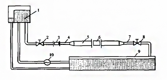 1一溢流水塔;2一截止閥:3一標(biāo)準(zhǔn)流量計(jì)( E-mag dN1000);4一DNI000管路;5大管徑試驗(yàn)管路;6—被檢流量計(jì);7一DN1000管路;8一調(diào)節(jié)閾;9—蓄水池;10一泵