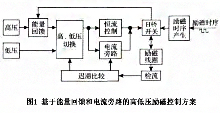 基于能量回饋和電流旁路的高低壓勵磁控制方案框圖如圖 1 所示, 主要由高低壓電源、能量回饋電路、高低壓切換電路、便流控制電路、電流旁路電路、互橋開關(guān)電路、檢流電路和勵磁時序產(chǎn)生電路組成。