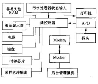該系統(tǒng)的硬件組成如圖1所示。微控制器采用89C52;探頭選用壓力式探頭,可克服超聲波式探頭易受污水中泡沫干擾的弊病;A/D轉(zhuǎn)換器選用AD1674;時鐘芯片選用DS1302;液晶顯示器為點陣式的MGLS19264,可顯示四行漢字;非易失性RAM選用DS1230;打印機為普通微型打印機;采樣脈沖輸岀端口用來輸出采樣脈沖,控制采樣器采樣污水;污水處理器狀態(tài)輸入端口可輸入污水處理器的通斷時間,供遠程監(jiān)控作用