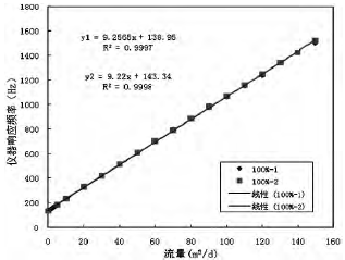 在大慶油田進行了模擬井實驗,對電磁流量計系統進行了動態測試,結果如圖4所示。其中橫軸表示測量系統中流體通過的體積流速,用流體體積與天數之比表示,單位是m3/d;縱軸表示儀表響應頻率的值,單位是Hz。