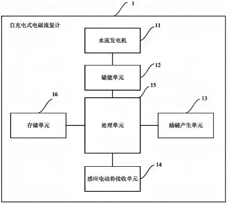 為實現上述目的及其他相關目的,本儀表是提供一種自充電式電磁流量計,其至少包括:設置在水流經過的管道內的水流發電機,其殼體的入水口呈喇叭狀,該殼體內設有葉輪、齒輪增速單元、永磁直流發電機;與所述水流發電機連接的儲能單元;用于基于控制信號來產生磁場的勵磁產生單元;用于基于所述勵磁產生單元產生的磁場來產生相應感應電動勢的感應電動勢接收單元;與所述勵磁產生單元、感應電動勢接收單元及儲能單元連接且用于輸出所述控制信號及將所述感應電動勢接收單元輸入的數據進行處理的處理單元;以及與所述處理單元連接的存儲單元。