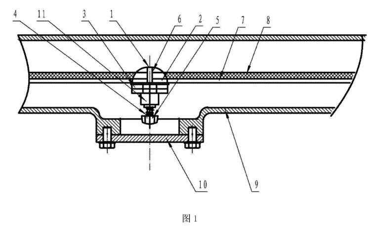 圖1所示,可拆卸電極的電磁流量計由外殼9及安裝于外殼內(nèi)的測量管7、及電極組件組成,在測量管內(nèi)側(cè)安裝有測量管襯里8,以隔絕測量介質(zhì)和測量管的接觸。在外殼9上設有凸臺,所述凸臺上開有中心孔,并通過緊固螺栓固定有壓蓋10。電極組件由電極軸以及安裝于電極軸上的電極頭1、電極座6和絕緣電極座套2組成,在所述電極軸的外端部設置有旋鈕5,所述電極軸上螺接有壓緊螺母3和絕緣座套11,在絕緣座套11與所述旋鈕之間的電極軸上套接有彈簧4,以增加電極頭1的穩(wěn)固性。本實用新型不僅方便拆卸,而且正常使用時,電極頭也能很牢固地定位,可有效滿足測量需求。