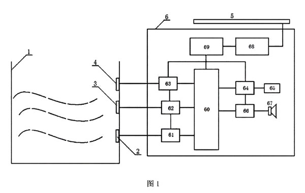 參照圖1,一種鉆井泥漿儲罐液位報警裝置,包括泥漿儲罐1、傳感器2-4、報警器6和太陽能電池5,所述泥漿儲罐1一側(cè)的內(nèi)壁上,自下而上順次設(shè)有第 一傳感器2、第 二傳感器3和第 三傳感器4,所述報警器6包括蓄電池68、穩(wěn)壓電路69、中央處理器60、第 一轉(zhuǎn)換電路61、第 二轉(zhuǎn)換電路62、第 三轉(zhuǎn)換電路63、隔離電路64、網(wǎng)絡(luò)接口65、放大電路66和喇叭67;所述第 一傳感器2通過第 一轉(zhuǎn)換電路61與中央處理器60的第 一輸入端相連接,第傳感器3通過第 二轉(zhuǎn)換電路62與中央處理器60的第 二輸入端相連接,第 三傳感器4通過第 三轉(zhuǎn)換電路63與中央處理器60的第 三輸入端相連接,中央處理器60的一輸出端通過隔離電路64與網(wǎng)絡(luò)接口65相連接,中央處理器60的另一輸出端通過放大電路66與喇叭67相連接,所述太陽能電池5與蓄電池68相連接,蓄電池68通過穩(wěn)壓電路69與中央處理器60、第 一轉(zhuǎn)換電路61、第 二轉(zhuǎn)換電路62、第 三轉(zhuǎn)換電路63、隔離電路64及放大電路65相連接。其中,所述第 一傳感器2、第 二傳感器3及第 三傳感器4均為壓電陶瓷片。所述中央處理器60為單片機(jī)電路或可編程控制器。